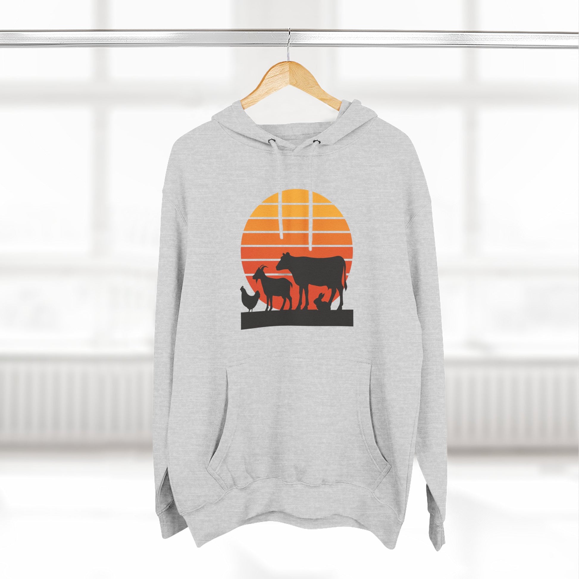 Wrap yourself in quiet, country evenings with this three-panel fleece hoodie. The soft, medium-heavy fabric and brushed interior hold in warmth without feeling bulky. A sunstrip silhouette printed across the chest frames the simple farm animals—chicken, goat, rabbit and cow—giving a warm, nostalgic nod to barnyard life at dusk. The roomy kangaroo pocket and adjustable hood make it easy to pull on and head out for an early-morning feed, an evening stroll through fields, or a low-key weekend around the farmhouse. Clean lines and optional chest embroidery keep the look fresh and wearable every day.